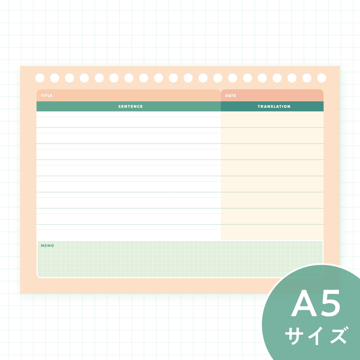左側(裏面)に長文、右側(表面)に単語が書けるルーズリーフです。