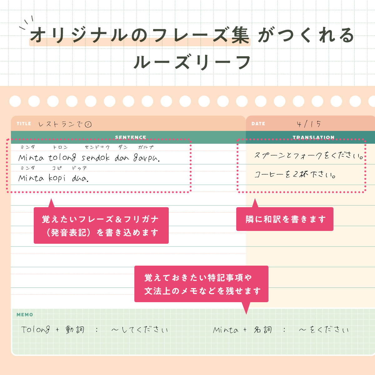こちらは先ほどのものとは違い、旅行会話などのちょっとしたフレーズを自分用にまとめることに特化したルーズリーフです。