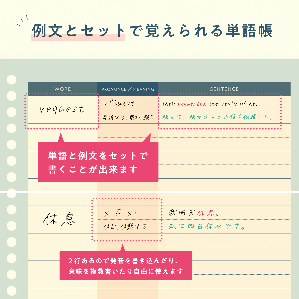 ②の「単語帳がセットになったルーズリーフ」と似ているのですが、こちらはより単語欄が詳細になっていて、ピンインや発音記号、例文などが書き込める仕様になっています。