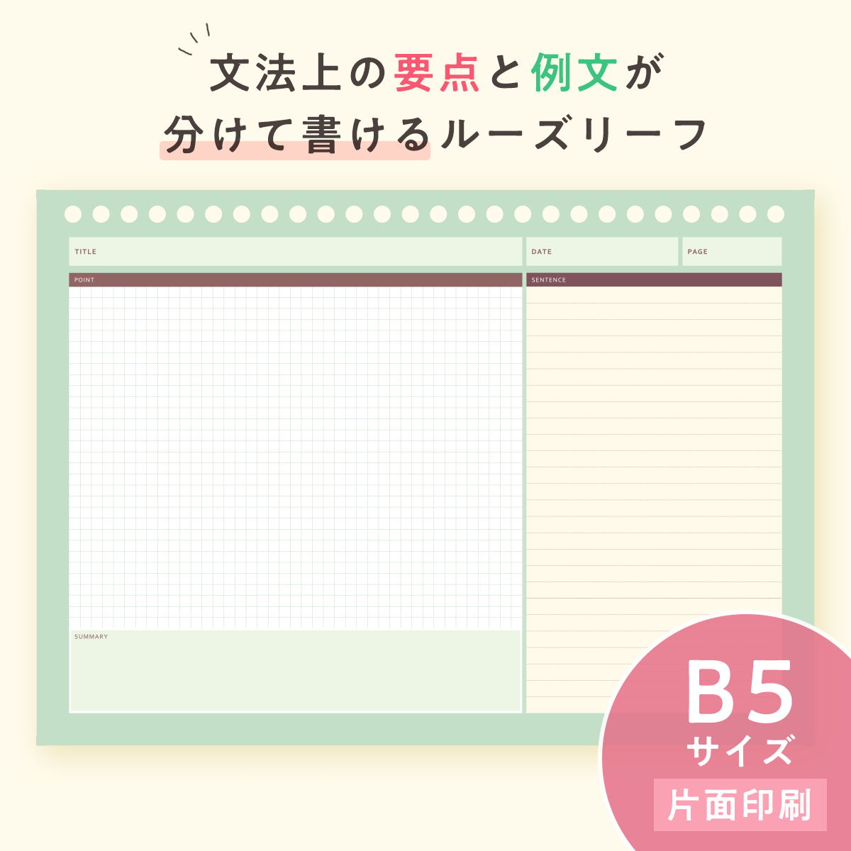 こちらのルーズリーフは情報をセクション分けできるのが最大のポイントです。外国語関連の試験や検定など、「文法」が重要になってくる勉強に最適です。